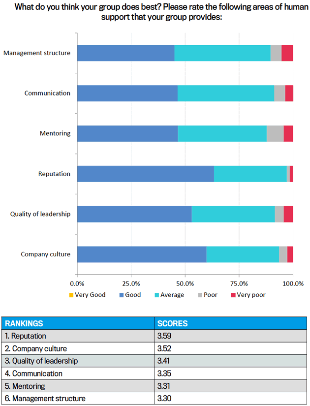 That was followed by company culture on 3.52, quality of leadership on 3.41, communication on 3.35, mentoring on 3.31 and management structure on 3.30.